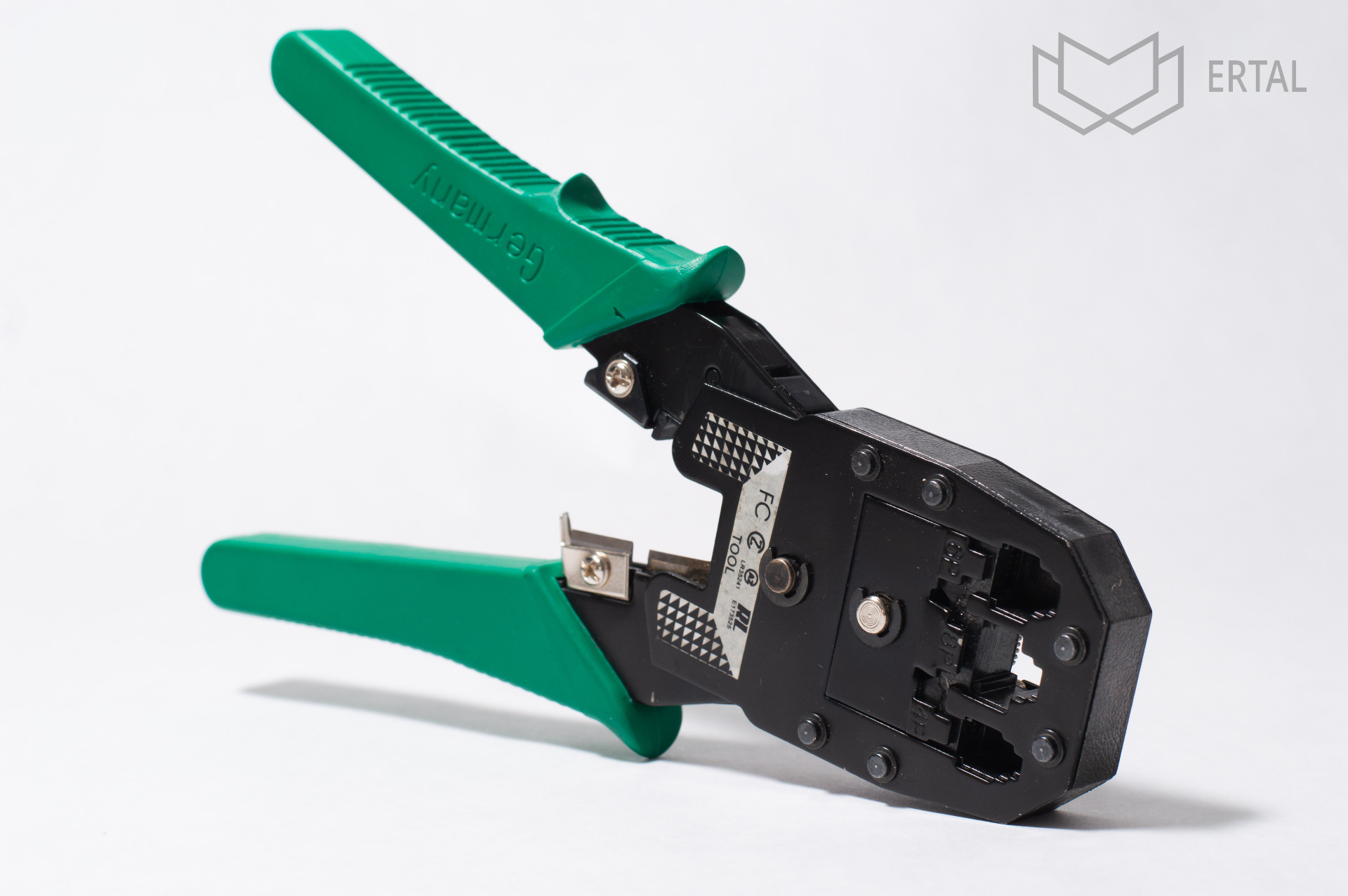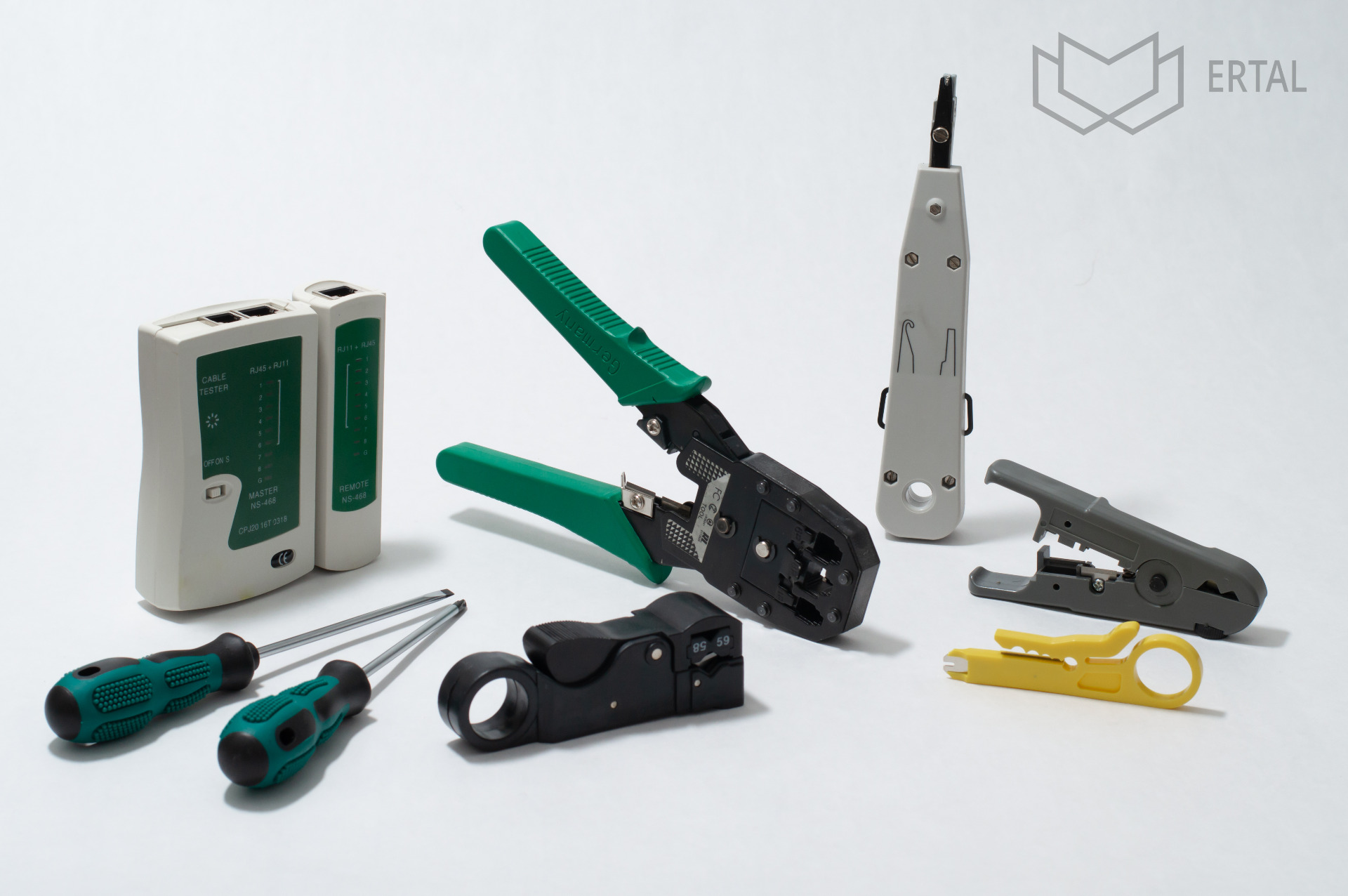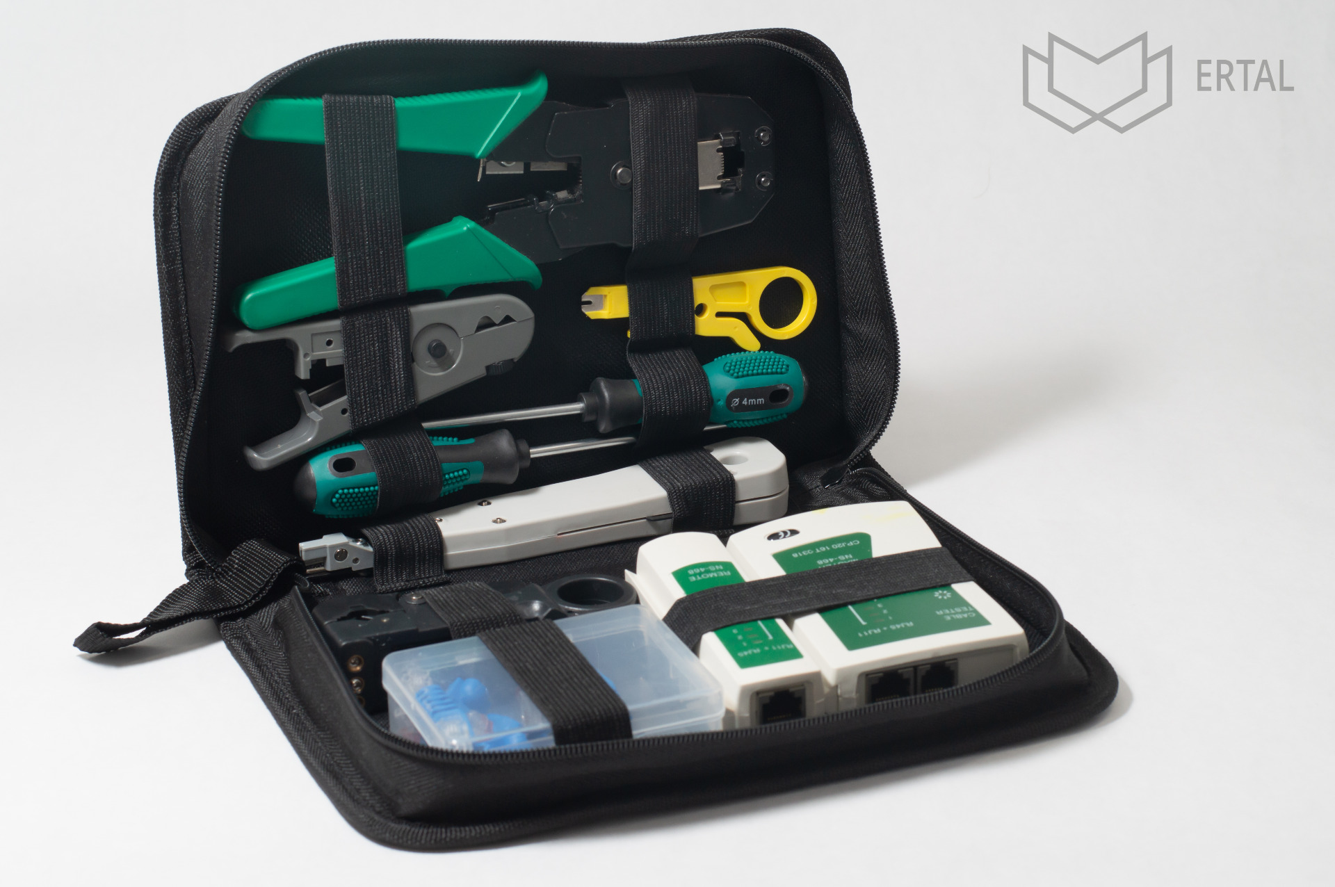 Sada pre krimpovanie rj45 konektorov, obsahuje rj45 kliešte, tester na konektory, nástroje na odblankovanie kábla, rj45 konektory, krone kliešte